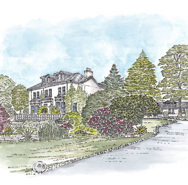 The property, set in 8 acres on the north side of the river Dee, is built on "lot 13" of the original Wood of Pitfodels, which was set out to feu in 1846 by John Menzies, the Laird of Pitfodels, who at that time lived in Pitfodels Castle on the banks of the River Dee, which was then destroyed and rebuilt, and is now known as Norwood Hall.